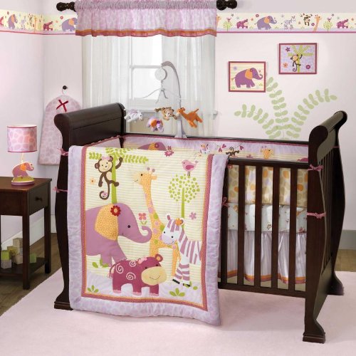 The Lil' Friends 4 Piece Baby Crib Bedding Set includes: quilt, bumper, dust ruffle and fitted sheet. The quilt measures 34 inches by 43 inches. The 4-piece bumper is 9.5 inches high and 154 inches long. The long sides are 9.5 inches x 50.5 inches, with 4 sets of double ties along the top and bottom. The short sides measure 9.5 inches x 26.5 inches with double ties on each corner. The dust ruffle has a 10 inch drop and the fitted sheet is made to fit a standard size 28 inch x 52 inch crib mattress. The set is made of 58% cotton and 42% polyester fabrics. The platform of the dust ruffle is 100% olefin. All filling is 100% polyester fiberfill. Care instructions: machine wash cold with like colors in gentle cycle. Do NOT bleach. Tumble dry low and iron on lowest setting as needed.